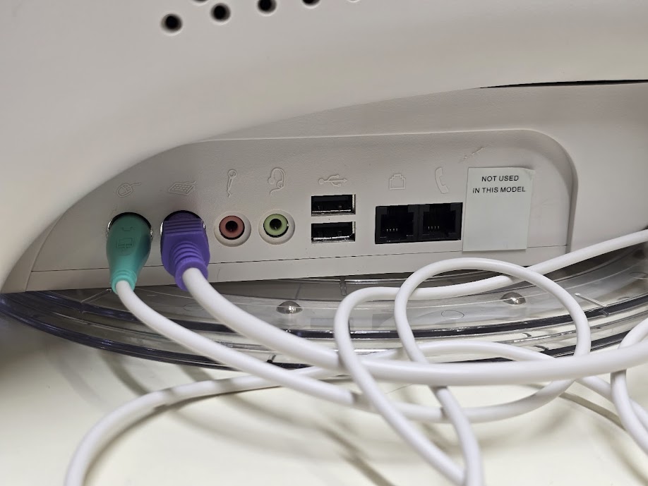 - Ports are accessible on the right side of the machine, but they are not hidden by a door. Available ports are keyboard and mouse PS/2, microphone, headphones, USB, and line and telephone RJ11. There is a hole cut for an unused port, but it is covered by a sticker with nothing but metal shielding on the other side.