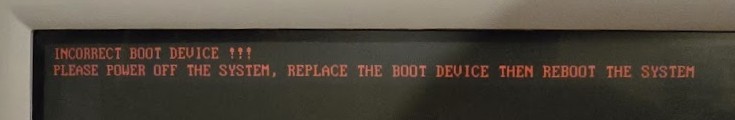 My first step was trying to boot from an IDE device connected to the 40-pin header. Unfortunately, the BIOS throws an "INCORRECT BOOT DEVICE !!!" message and halts whenever a bootable device is attached to the IDE header.